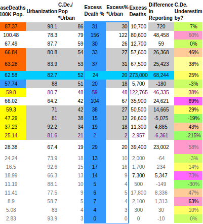 COVID-19 analysis: Compararison of countries by available outcomes. Highlighted are high-income, high-population nations (< 1 yr. after COVID-19 detection). Urbanization (population % in cities) was found to correlate poorly to outcome.